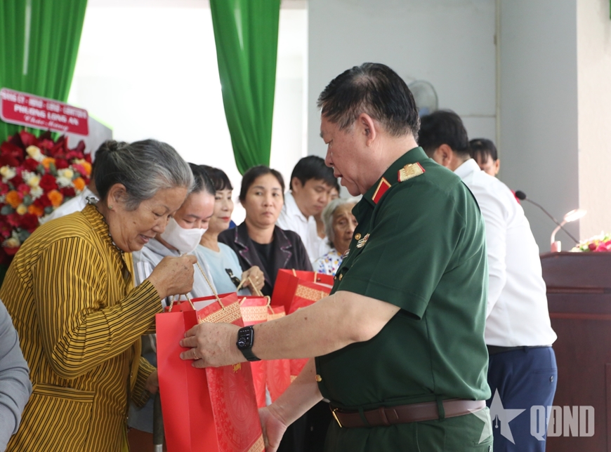 | Đại tướng Nguyễn Trọng Nghĩa trao lẵng hoa và quà của Quân ủy Trung ương, Bộ Quốc phòng tặng phường Long An, khu phố Phú Nhơn. |