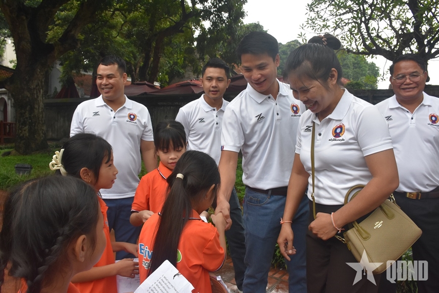 | Đoàn cán bộ Báo QĐND Lào và các em học sinh trên địa bàn Hà Nội. |