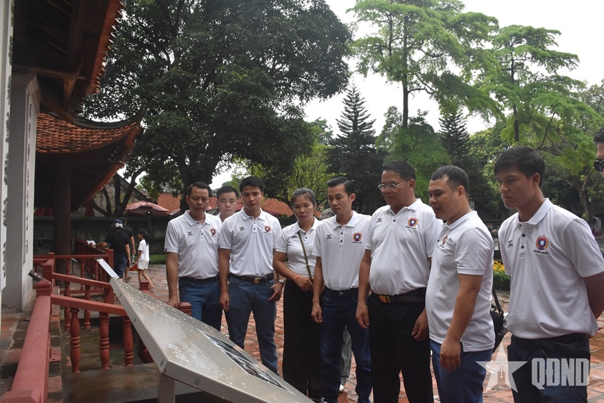 Tại Khu Di tích Văn Miếu - Quốc Tử Giám, đoàn được nghe giới thiệu về lịch sử, ý nghĩa của từng khu vực trong Văn Miếu-Quốc Tử Giám, tận mắt chứng kiến sự độc đáo của kiến trúc Việt Nam xưa.