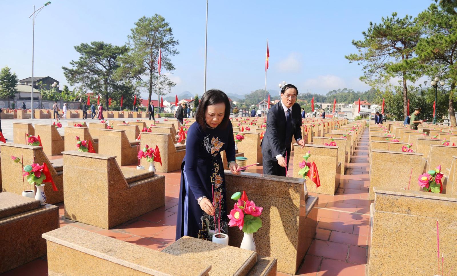 Đồng chí Đoàn Thị Hậu, Phó Bí thư Thường trực Tỉnh ủy, Chủ tịch HĐND tỉnh thắp hương tưởng nhớ các anh hùng liệt sĩ tại Nghĩa trang liệt sĩ Lạng Sơn. Ảnh: Trí Dũng.