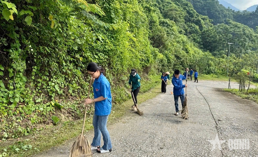 | Đoàn viên thanh niên dọn dẹp, vệ sinh tuyến đường lên nghĩa trang liệt sĩ. |
