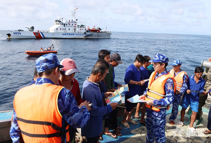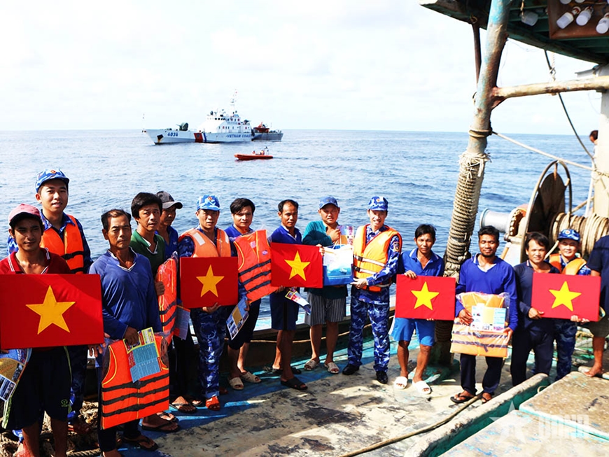 Cùng với đó, đoàn công tác còn phát tờ rơi, tài liệu hướng dẫn, trao tặng cờ Tổ quốc và các phần quà gồm nhiều nhu yếu phẩm thiết yếu cho ngư dân. Những phần quà tuy nhỏ nhưng mang ý nghĩa động viên tinh thần, giúp bà con thêm yên tâm vươn khơi, bám biển, vừa phát triển kinh tế, vừa góp phần bảo vệ chủ quyền biển, đảo của Tổ quốc.
