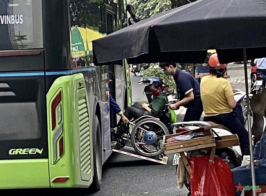 Nhân viên giúp người khuyết tật lên xe buýt điện. |