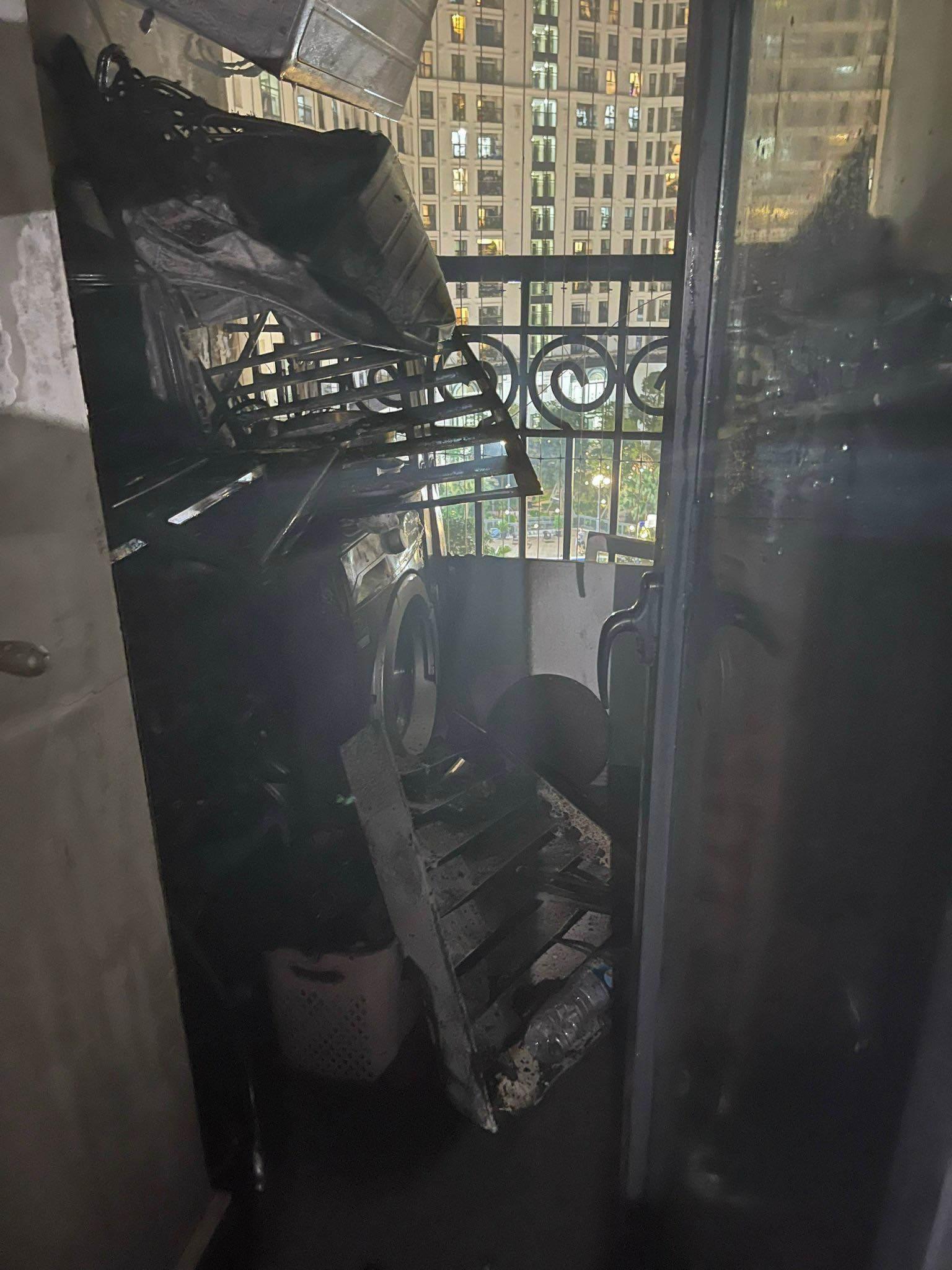 Nhiều đồ đạc tại ban công của căn hộ bị cháy hư hỏng