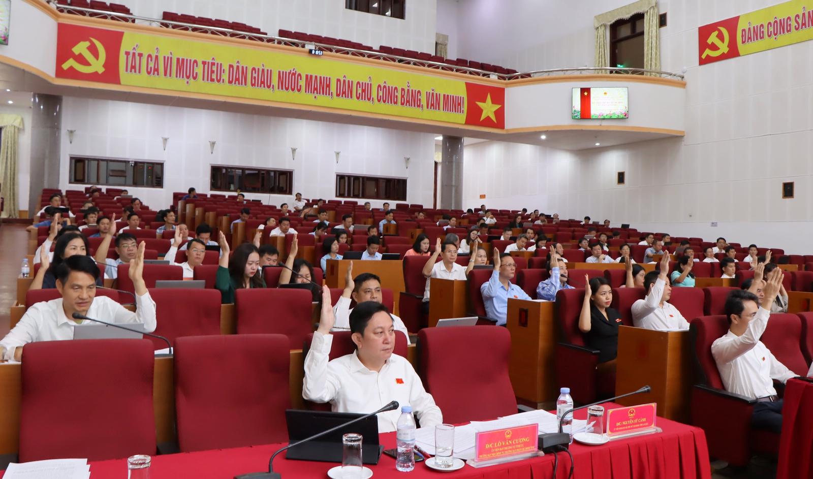 Trên cơ sở xem xét các báo cáo, tờ trình do Thường trực HĐND, UBND tỉnh trình kỳ họp, cùng các báo cáo thẩm tra của các Ban HĐND tỉnh và đối chiếu các quy định hiện hành, HĐND tỉnh đã thảo luận, biểu quyết thông qua 15 nghị quyết thuộc 4 nhóm: Nhóm cơ chế, chính sách: 4 nghị quyết. Nhóm ngân sách và đầu tư công: 4 nghị quyết. Nhóm nghị quyết bãi bỏ, sửa đổi, bổ sung để phù hợp với quy định hiện hành: 2 nghị quyết. Nhóm nghị quyết khác theo đề nghị của UBND tỉnh: 5 nghị quyết.
