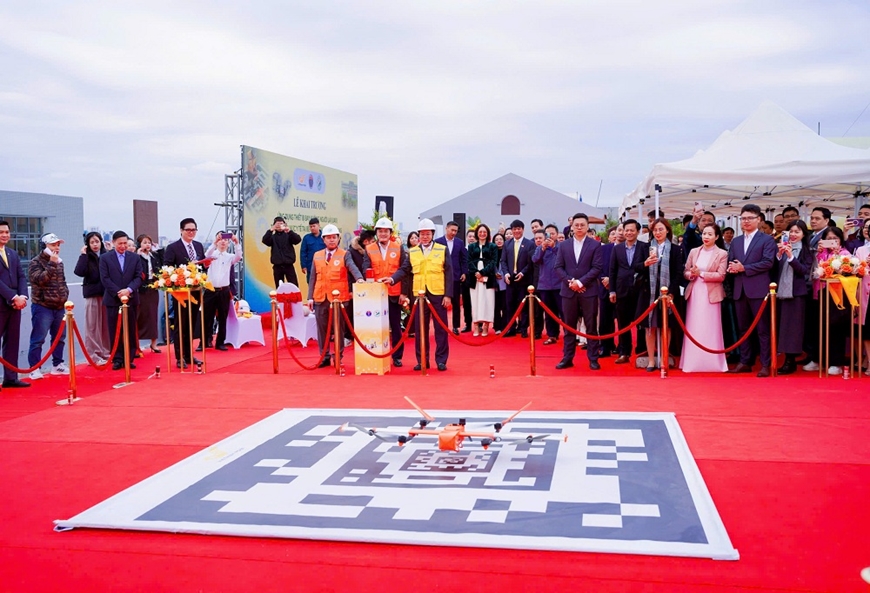Lãnh đạo các cấp, ngành thực hiện nút khởi động triển khai thiết bị bay không người lái vận chuyển trong y tế. Ảnh: TRẦN ANH |