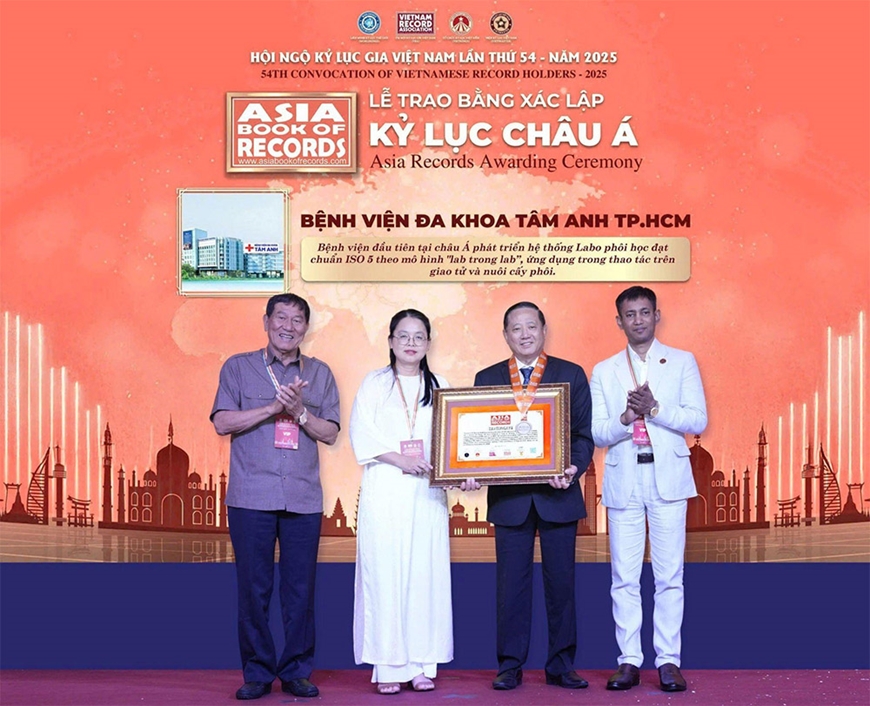 Bệnh viện Đa khoa Tâm Anh TP Hồ Chí Minh vừa được Tổ chức Kỷ lục châu Á xác lập Kỷ lục “Bệnh viện đầu tiên tại châu Á có Hệ thống Lab phôi học đạt chuẩn ISO 5 theo mô hình “lab trong lab”, ứng dụng trong thao tác trên giao tử và nuôi cấy phôi”. Đây là lần đầu tiên một bệnh viện ở Việt Nam xác lập kỷ lục châu Á về hệ thống phòng "lab trong lab" thụ tinh ống nghiệm.