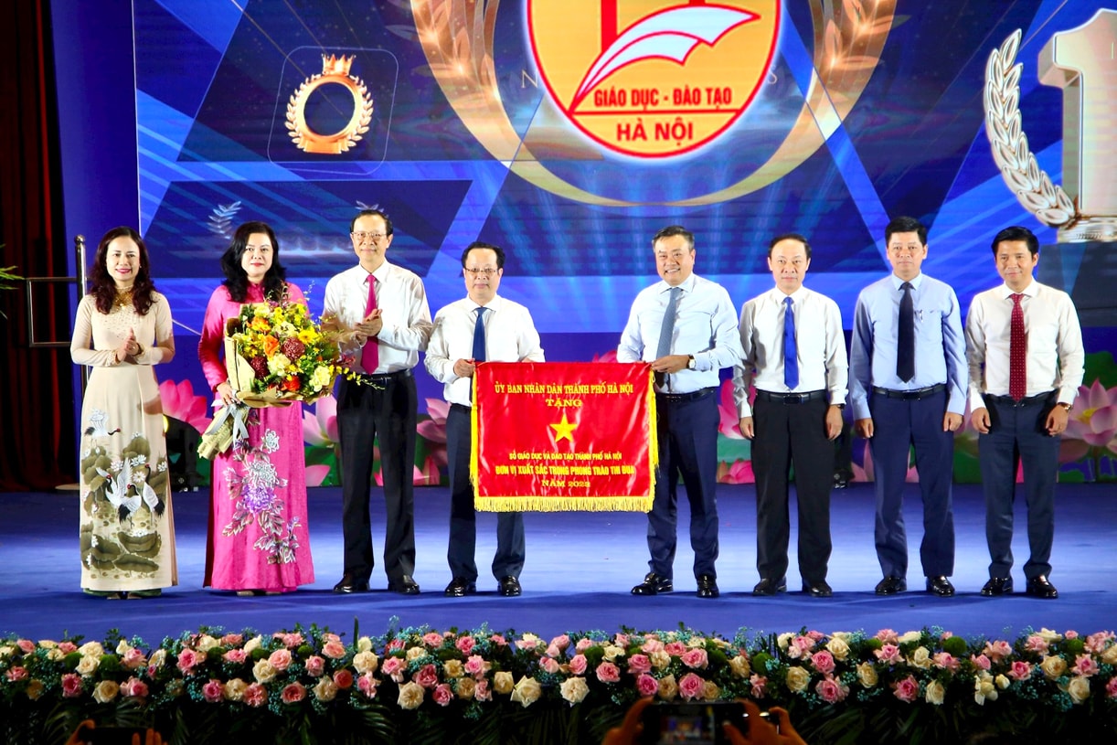 Ủy viên Trung ương Đảng, Phó Bí thư Thành ủy, Chủ tịch UBND thành phố Hà Nội Trần Sỹ Thanh cùng Thứ trưởng Bộ Giáo dục và Đào tạo Phạm Ngọc Thưởng tặng Cờ đơn vị xuất sắc dẫn đầu phong trào thi đua năm 2023 cho Sở Giáo dục và Đào tạo Hà Nội. Ảnh: Viết Thành
