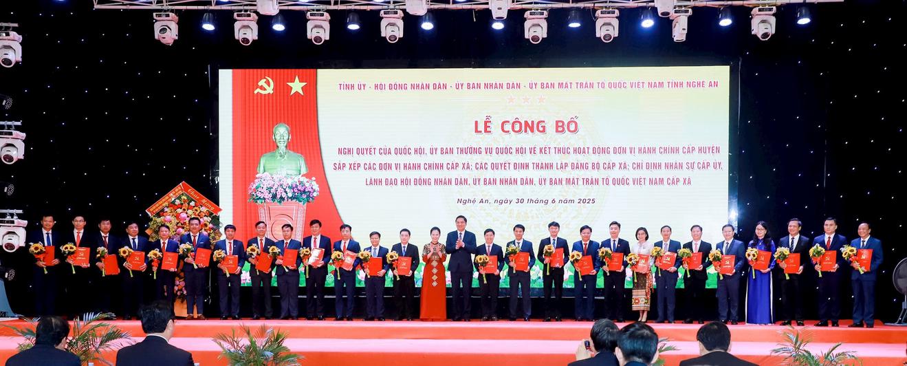 Sáng 30/6, Tỉnh ủy, HĐND, Ủy ban MTTQ Việt Nam tỉnh Nghệ An tổ chức Lễ công bố Nghị quyết của Quốc hội, Ủy ban Thường vụ Quốc hội về kết thúc hoạt động đơn vị hành chính cấp huyện, sắp xếp các đơn vị hành chính cấp xã; các quyết định thành lập đảng bộ cấp xã; chỉ định nhân sự cấp ủy, lãnh đạo HĐND, UBND, Ủy ban MTTQ Việt Nam cấp xã.