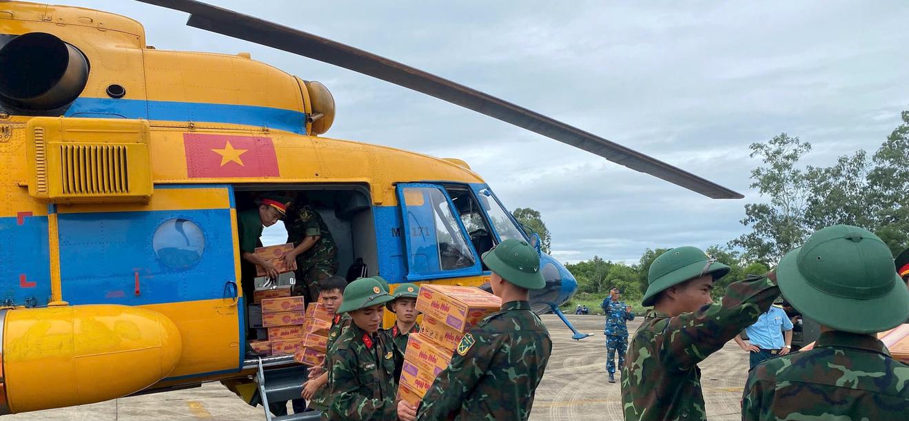 Ngay trong sáng 24/7, tại sân bay Vinh, hai chiếc trực thăng của Công ty Trực thăng Miền Bắc và Trung đoàn 916 đã cất cánh. Trên khoang là hàng chục tấn hàng hóa thiết yếu: Gạo, mì tôm, nước đóng chai, thuốc men, áo phao, dụng cụ y tế… được phân loại tỉ mỉ và đóng gói chắc chắn để thả xuống các điểm nóng đang bị cô lập nghiêm trọng.