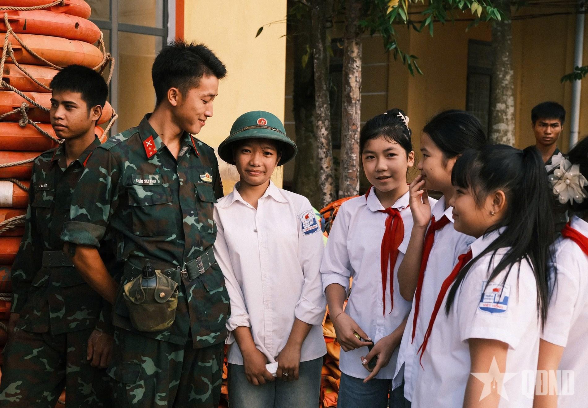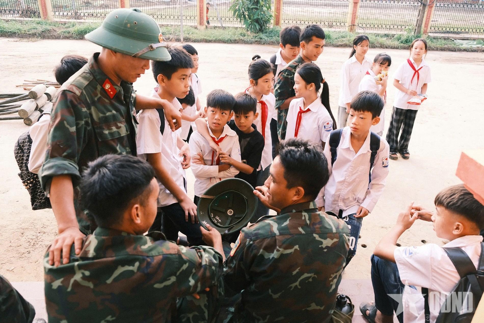 Các em học sinh chia tay cán bộ, chiến sĩ Trung đoàn 174. |