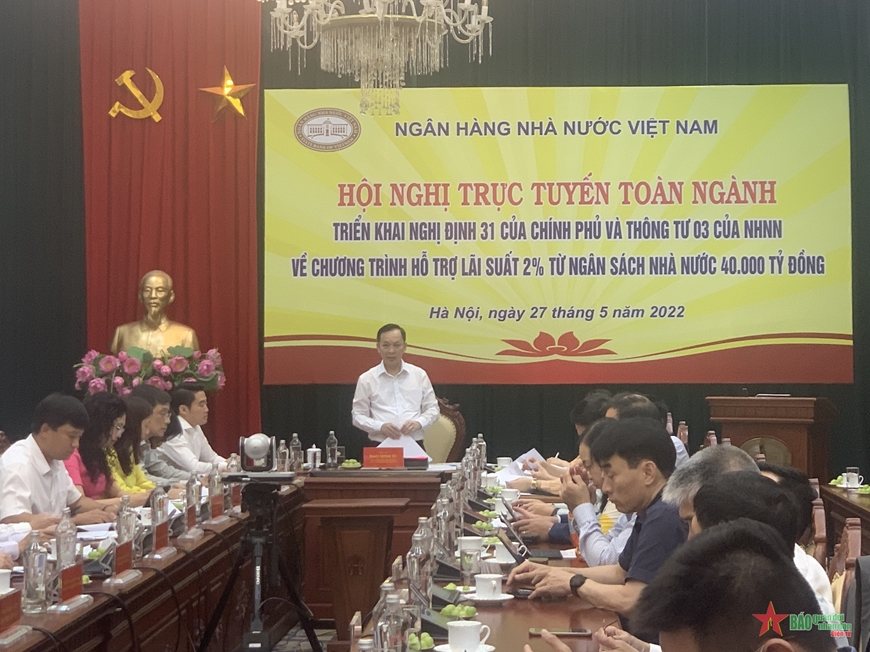 Sáng 27-5, tại Hà Nội, Ngân hàng Nhà nước Việt Nam tổ chức Hội nghị trực tuyến toàn ngành triển khai chương trình hỗ trợ lãi suất 2% từ nguồn Ngân sách Nhà nước 40.000 tỷ đồng theo Nghị định 31/2022/NĐ-CP của Chính phủ và Thông tư 03/2022/TT-NHNN của Ngân hàng Nhà nước Việt Nam.