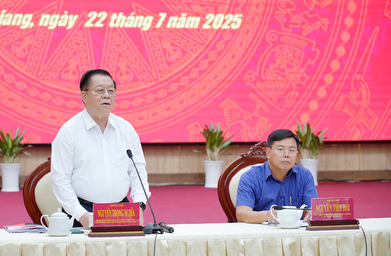 Phát biểu tại buổi làm việc, Trưởng ban Tuyên giáo và Dân vận Trung ương Nguyễn Trọng Nghĩa đánh giá cao sự chủ động, quyết liệt của An Giang trong thời gian qua. Tỉnh đã tập trung lãnh đạo, chỉ đạo và quán triệt sâu sắc các quan điểm của Trung ương, Bộ Chính trị, Ban Bí thư và các Ban Chỉ đạo Trung ương, nhất là trong công tác sắp xếp tổ chức bộ máy và phát triển kinh tế - xã hội.