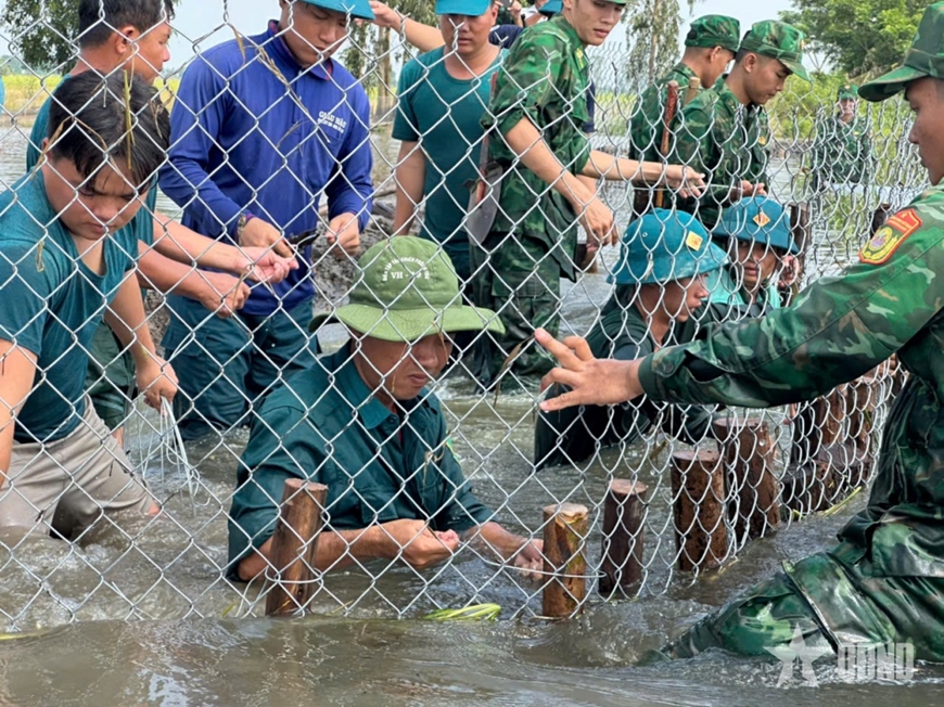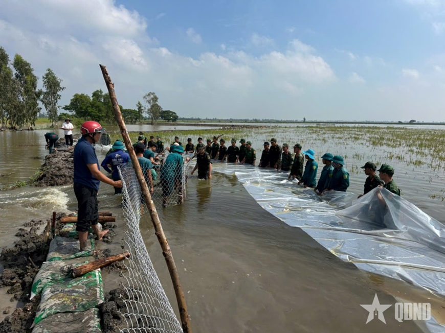 Ngay lập tức, 50 cán bộ, chiến sĩ các đơn vị được huy động cùng phương tiện, vật tư khẩn cấp triển khai công tác xử lý. Cán bộ, chiến sĩ đã sử dụng lưới B40 kết hợp với bạt nylon chống thấm và bao tải đất để ngăn dòng nước, gia cố thân đê. Sau hơn hai giờ nỗ lực vật lộn trong điều kiện nước lũ dâng cao và thời tiết khắc nghiệt, sự cố vỡ đê bao đã được khắc phục, bước đầu ngăn chặn được dòng nước tràn vào khu vực sản xuất. Đồng thời, tại các vị trí xung yếu khác, cán bộ, chiến sĩ tiếp tục phối hợp với chính quyền và nhân dân địa phương gia cố, đắp cao mặt đê, bảo đảm an toàn cho toàn tuyến.