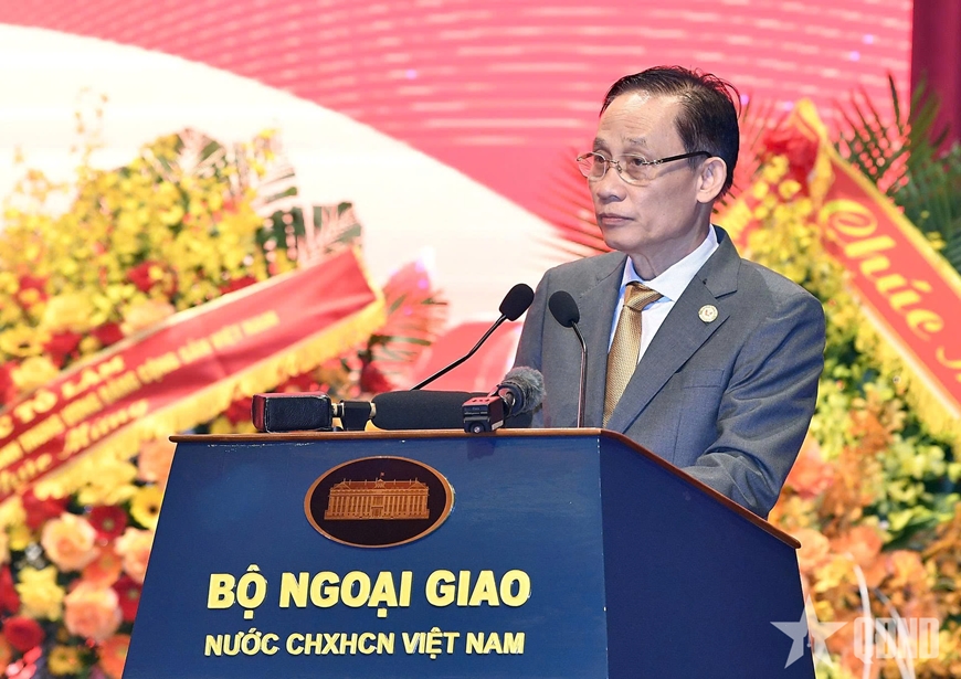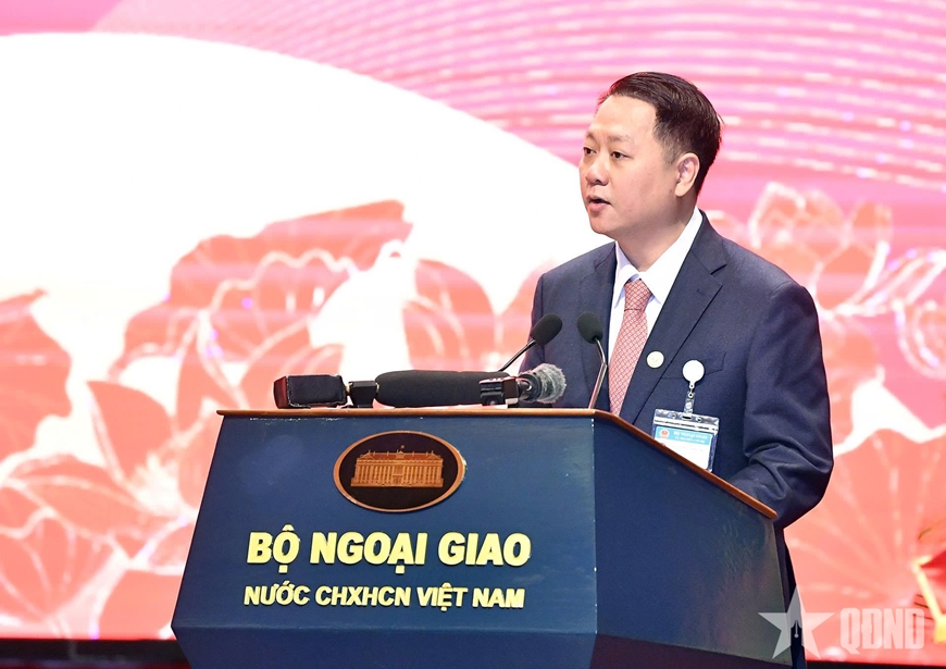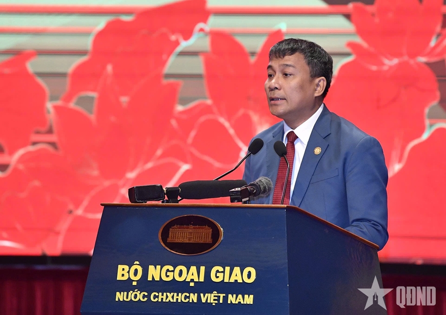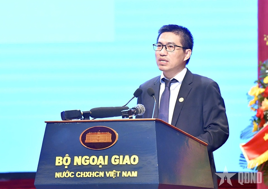 | Thứ trưởng Thường trực Bộ Ngoại giao Nguyễn Minh Vũ phát biểu tại đại hội. Ảnh: TRỌNG HẢI |