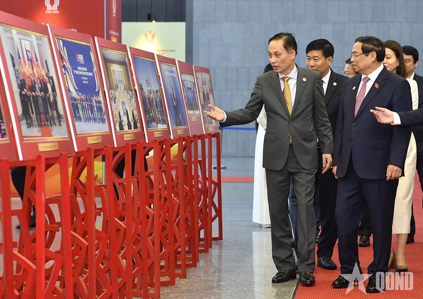 | Thủ tướng Phạm Minh Chính tham quan trưng bày ảnh về hoạt động ngoại giao. Ảnh: TRỌNG HẢI |