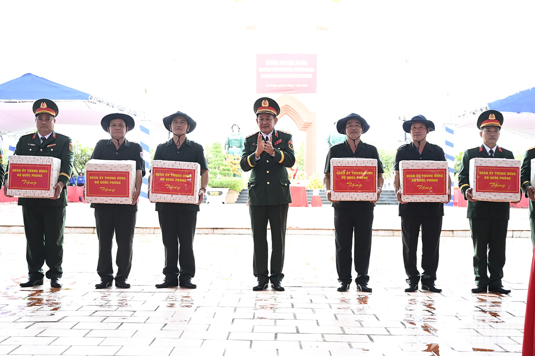 | Thượng tướng Võ Minh Lương tặng quà các đội tìm kiếm, quy tập hài cốt liệt sĩ Quân khu 9. |