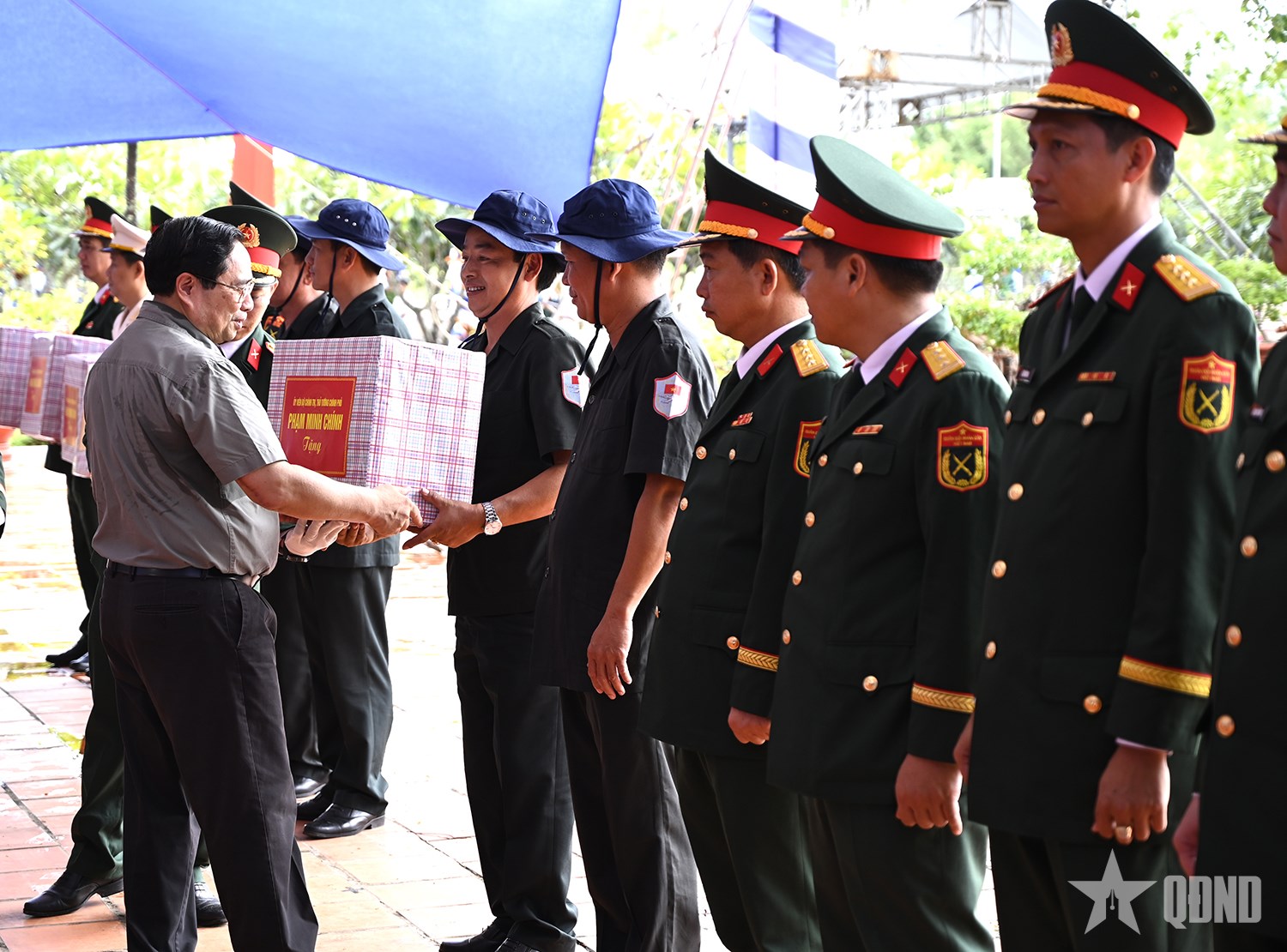 | Thủ tướng Phạm Minh Chính tặng quà các đội tìm kiếm, quy tập hài cốt liệt sĩ Quân khu 9. |