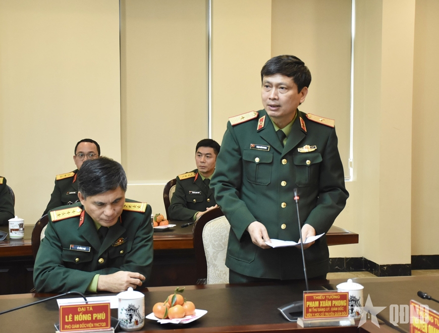 | Thiếu tướng, PGS, TS Phạm Xuân Phong, Giám đốc Viện Y học cổ truyền Quân đội báo cáo kết quả công tác của viện trong năm 2025. |