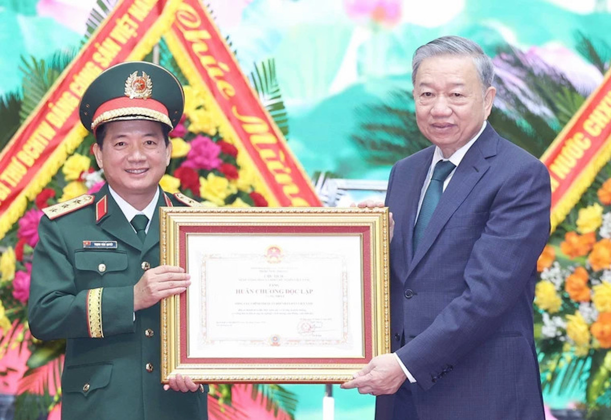 Tổng Bí thư Tô Lâm trao tặng Huân chương Độc lập hạng Nhất cho Tổng cục Chính trị Việt Nam. Ảnh: TTXVN