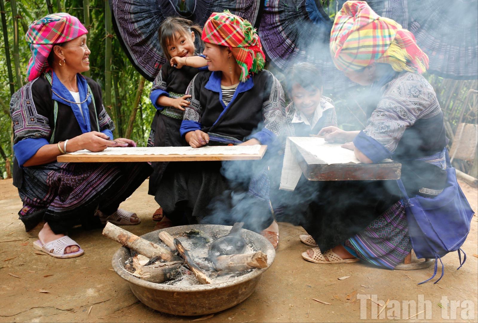 Bên khung vải, tiếng nói cười rộn ràng, ánh mắt hiền hậu và nụ cười rạng rỡ của người Mông như hòa cùng hơi ấm của bếp lửa. Ảnh: Bùi Bình