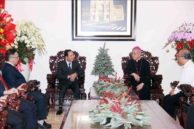 | Đồng chí Trịnh Văn Quyết (bên trái) chúc mừng Đức Tổng Giám mục Nguyễn Năng (bên phải), Tổng Giám mục Giáo phận TP Hồ Chí Minh nhân mùa Giáng sinh 2025. |