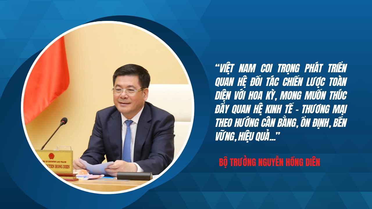 “Việt Nam coi trọng phát triển quan hệ Đối tác chiến lược toàn diện với Hoa Kỳ, mong muốn thúc đẩy quan hệ kinh tế - thương mại theo hướng cân bằng, ổn định, bền vững, hiệu quả với Hoa Kỳ; các bộ ngành của Việt Nam sẵn sàng đàm phán xử lý những vấn đề Hoa Kỳ quan tâm, cùng với Hoa Kỳ tìm ra các giải pháp hợp lý để hai bên cùng có lợi, trên tinh thần lợi ích hài hòa, rủi ro chia sẻ”, Bộ trưởng Nguyễn Hồng Diên nhấn mạnh.
