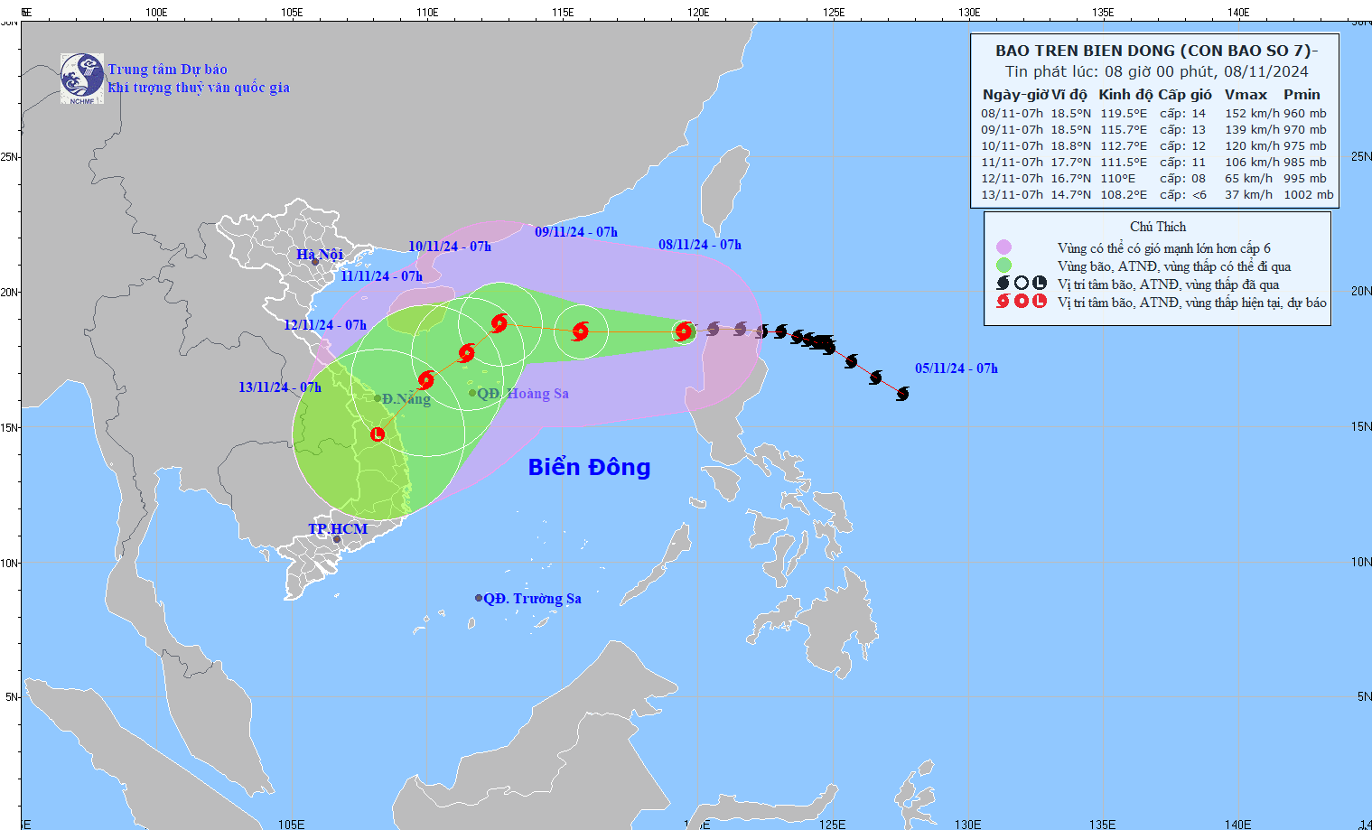 Dự báo mới nhất cho thấy, sau khi vào Biển Đông, bão số 7 di chuyển chủ yếu theo hướng Tây, hướng về phía Bắc Hoàng Sa, sau đó đổi hướng đi theo hướng Tây Tây Bắc rồi Tây Tây Nam hướng về vùng biển các tỉnh Trung Trung Bộ.