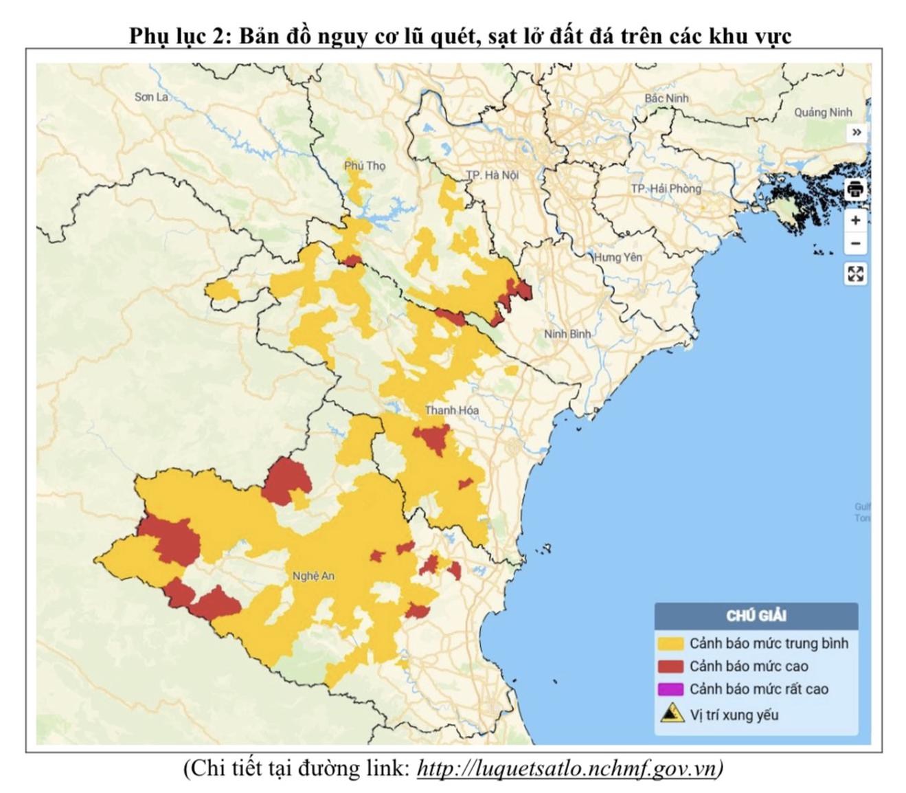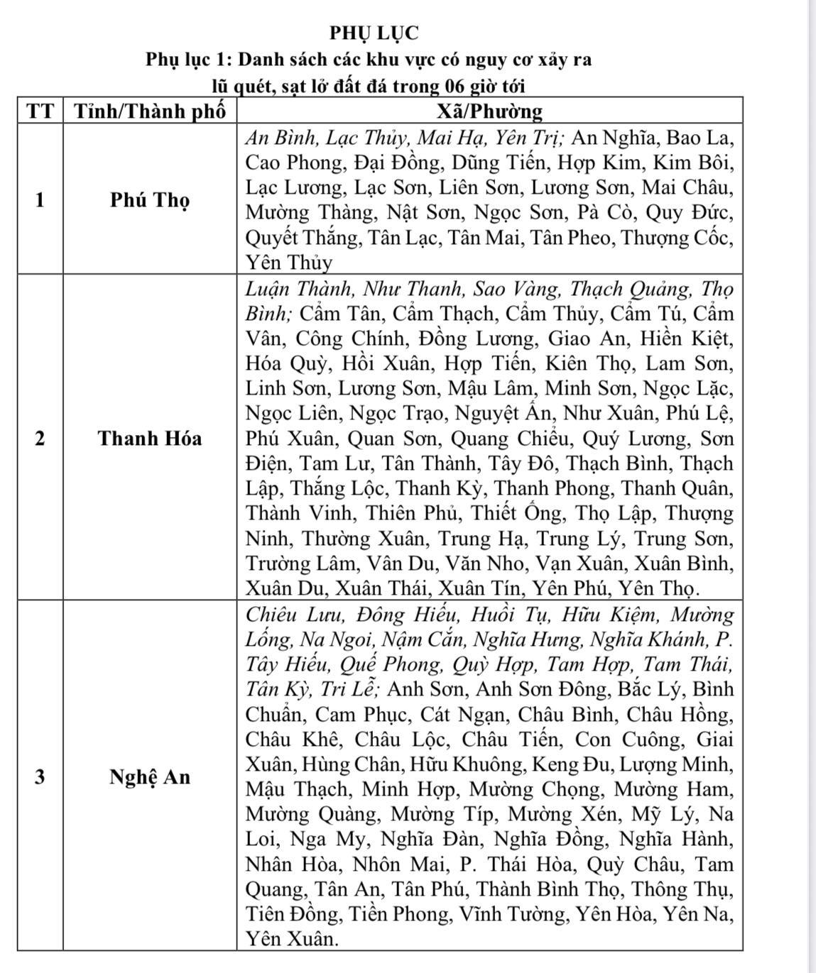 Cơ quan khí tượng cảnh bảo trong 06 giờ tới, do hoàn lưu bão, gây mưa lớn nên nguy cơ xảy ra lũ quét trên các sông, suối nhỏ, sạt lở đất trên sườn dốc tại nhiều xã/phường thuộc các tỉnh Phú Thọ, Thanh Hoá, Nghệ An như: