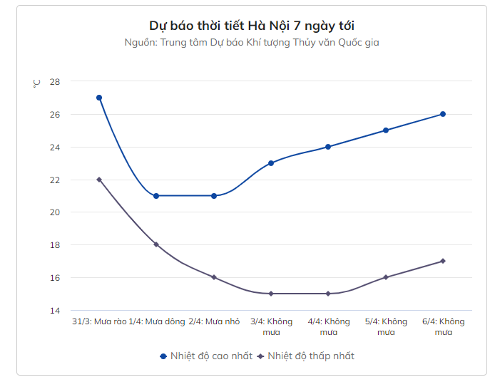 Theo trang dự báo Accuweather, Hà Nội có thể ghi nhận mức nhiệt thấp nhất 13 độ C đêm 1/4. Ban ngày, nền nhiệt tăng lên ngưỡng 18-20 độ C, trời lạnh. Khu vực cũng xuất hiện mưa dông liên tục ngày 31/3-1/4, sau đó hửng nắng.