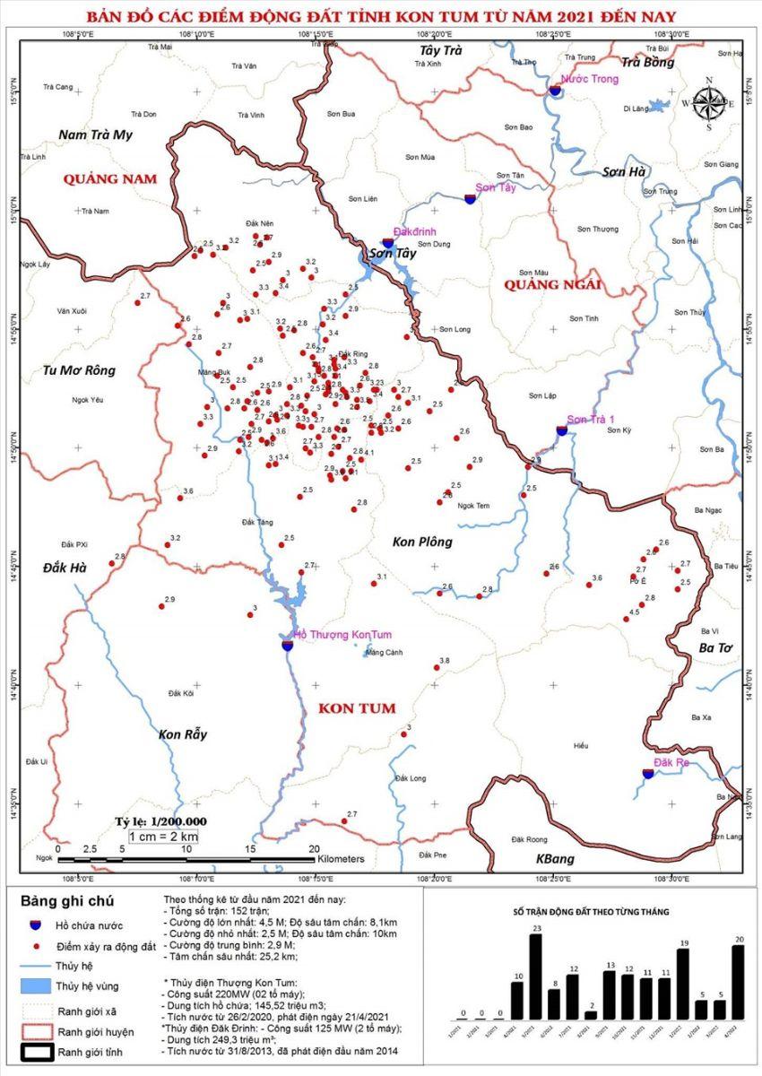 Sáng 19/4, tại cuộc họp do Ban chỉ đạo Quốc gia về Phòng, Chống thiên tai tổ chức với sự tham gia của các bộ, ngành, cơ quan liên quan, các công ty quản lý hồ chứa thủy lợi, thủy điện trên địa bàn tỉnh Kon Tum, đặc biệt là thủy điện Thượng Kon Tum, Viện Vật lý địa cầu cho biết: Từ năm 1903 đến năm 2020 chỉ xảy ra 33 trận động đất, nhưng chỉ riêng trong năm 2021 đã xảy ra tới 114 trận. Đặc biệt, từ ngày 15-18/4/2022 đã xảy ra 22 trận động đất, trong đó có trận động đất có độ lớn 4.5 (M=4,5) vào ngày 18.4 và trận động đất ngày 15/4 có M=4,1 trong năm 2021, tại huyện Kon Plong xảy ra hàng trăm trận động đất có độ lớn không quá 4.0 và không gây rủi ro thiên tai.