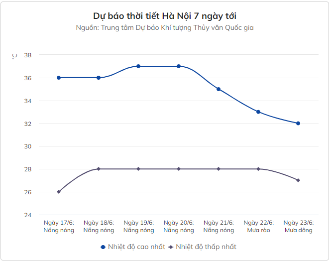 Trạng thái này duy trì đến hết ngày 20/6, sau đó Hà Nội và các địa phương lân cận giảm nhiệt, trở lại trạng thái mưa rào và dông với mức nhiệt 26-33 độ C.