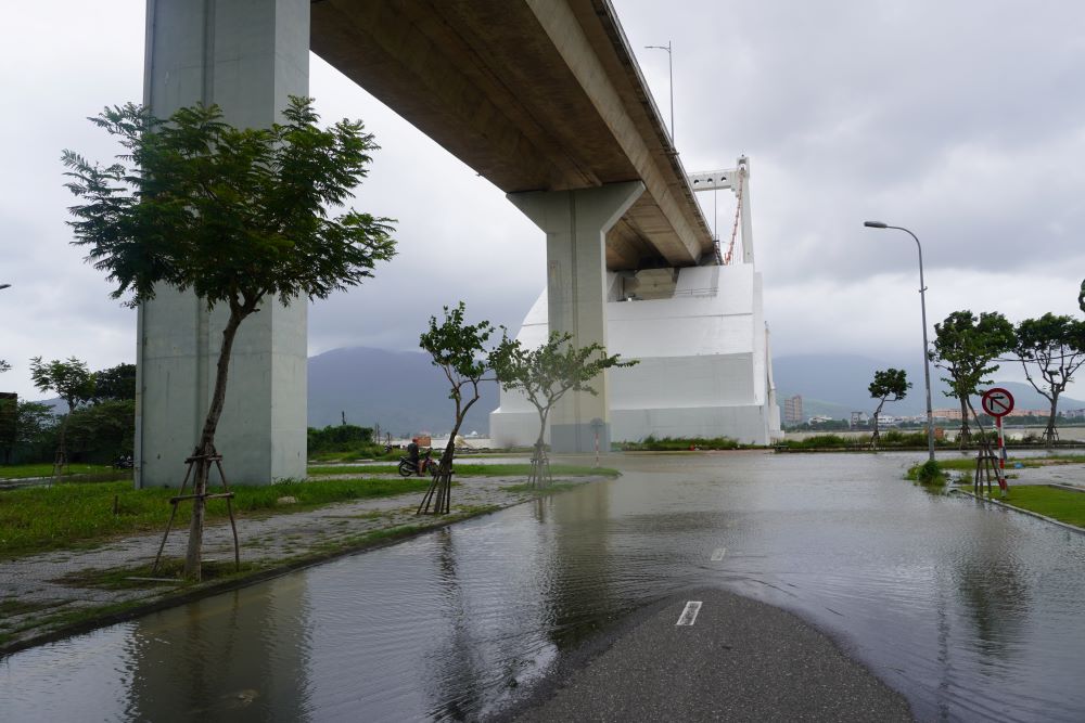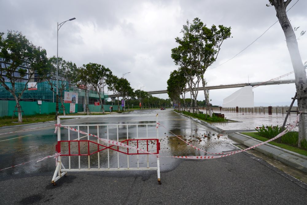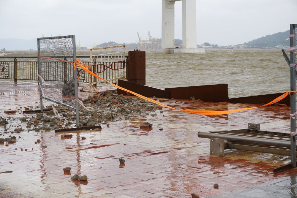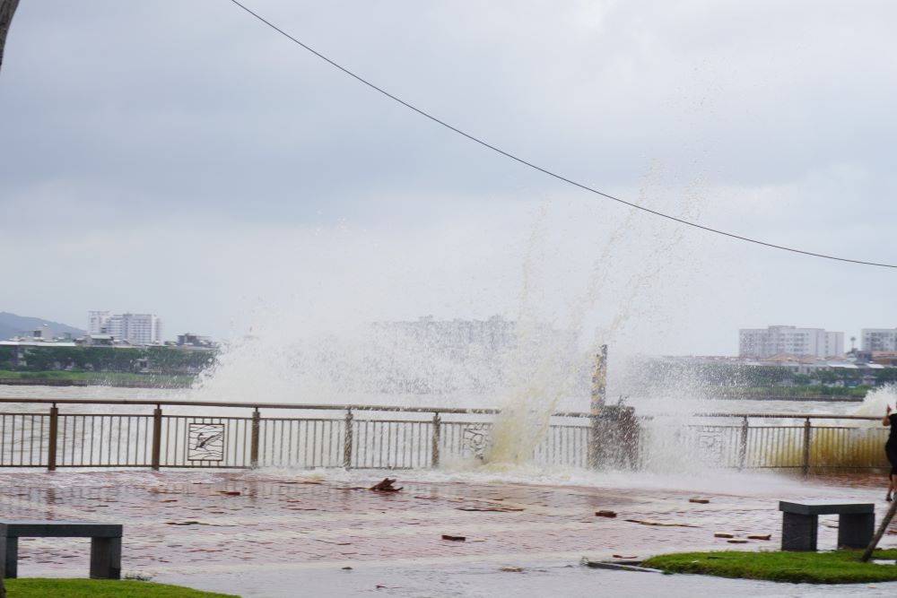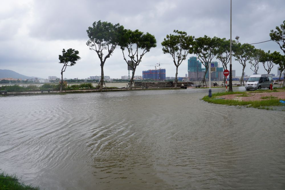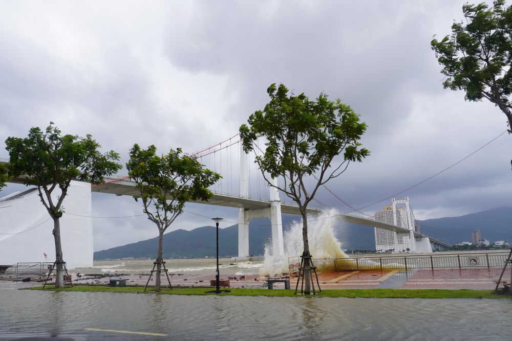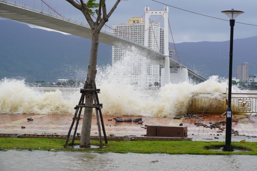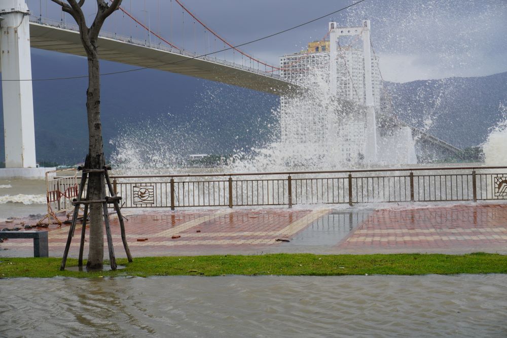Do ảnh hưởng của bão số 12, thủy triều lên cao kèm theo gió mạnh khiến sóng cao trên 3m liên tục ập vào bờ. Nhiều lúc, sóng mạnh vượt qua lan can chắn, bắn tung thành cột nước cao hơn mép kè rồi đổ ồ ạt xuống vỉa hè, tràn lan ra cả mặt đường.