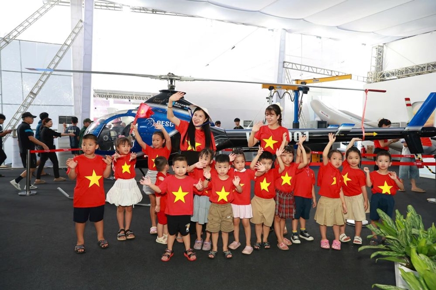 | Các em nhỏ chụp ảnh cùng máy bay trực thăng được trưng bày trong khu trưng bày của Công ty Cổ phần Dịch vụ Kỹ thuật hàng không (AESC). |