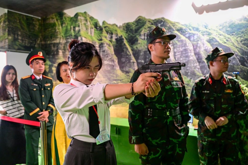 | Trải nghiệm hệ thống mô phỏng bắn súng của Tập đoàn Công nghiệp - Viễn thông Quân đội (Viettel). |