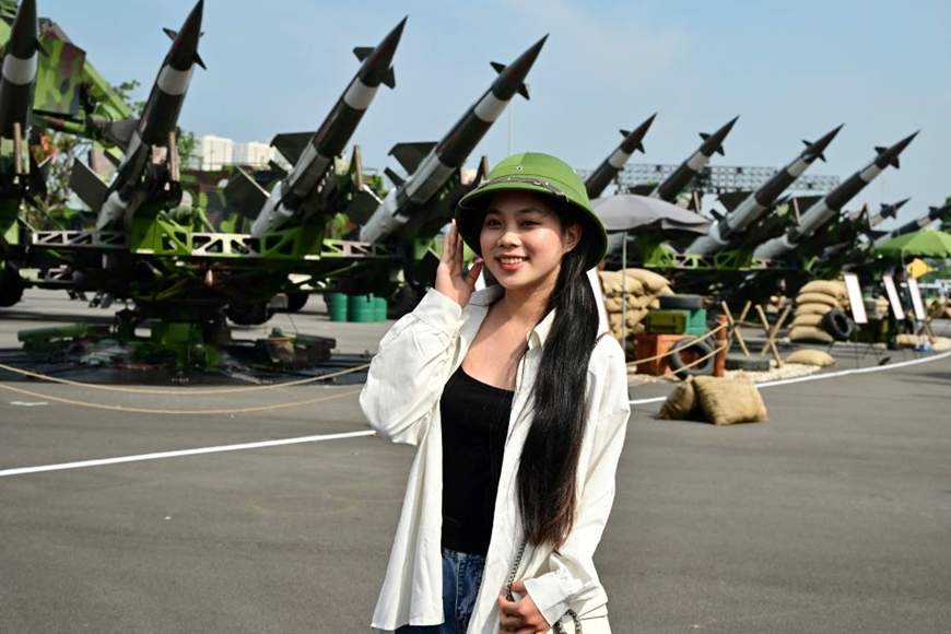 | Nhiều bạn trẻ thích thú với giàn khí tài hiện đại của Quân đội. |