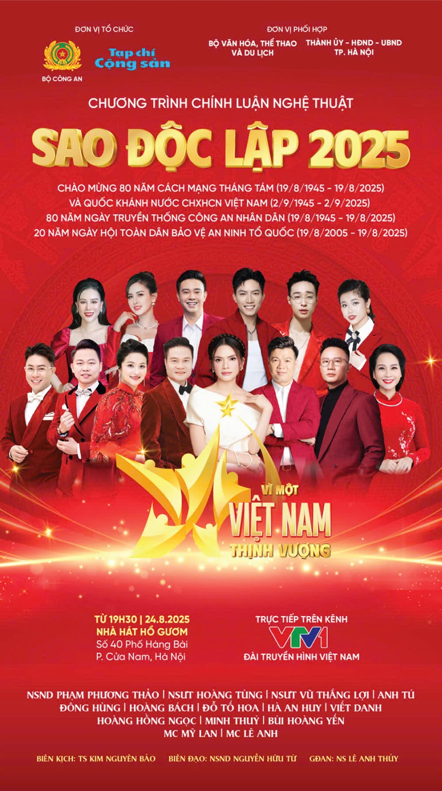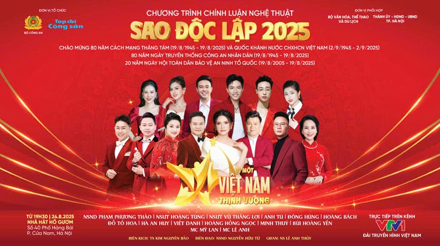 Chào mừng Kỷ niệm 80 năm Cách mạng Tháng Tám (19-8-1945/19-8-2025), Quốc khánh 2-9 (2-9-1945/2-9-2025), 80 năm Ngày Truyền thống lực lượng Công an nhân dân (19-8-1945/19-8-2025) và 20 năm Ngày hội toàn dân bảo vệ an ninh Tổ quốc (19-8-2005/19-8-2025), Bộ Biên tập Tạp chí Cộng sản, Bộ Công an chủ trì, phối hợp với Bộ Văn hóa - Thể thao và Du lịch, Thành ủy - HĐND - UBND TP Hà Nội tổ chức Chương trình chính luận nghệ thuật “Sao Độc lập” năm 2025 (năm thứ X) với chủ đề: “Vì một Việt Nam thịnh vượng” vào lúc 20 giờ 10 phút ngày 24-8-2025, tại Nhà hát Hồ Gươm (Hà Nội).