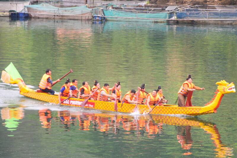 Nhiều trò chơi dân gian hấp dẫn được tổ chức như thi đua thuyền, đi cầu thăng bằng trên hồ, quăng chài, bịt mắt bắt vịt. Trong đó, đua thuyền là nội dung thu hút nhất với sự tham gia của 6 đội, gần 100 vận động viên đến từ các bản trong xã. Tiếng reo hò cổ vũ vang dội khi những con thuyền lướt sóng về đích, tạo không khí sôi động ngày hội.