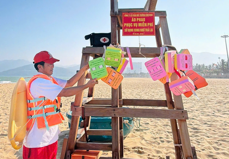 Công ty CP Môi trường Bình Định triển khai 8 điểm cho mượn áo phao miễn phí dọc bờ biển nhằm đảm bảo an toàn cho người dân và du khách khi tắm biển.