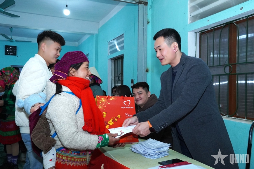 | Anh Nguyễn Văn Hùng, đại diện Quỹ Thiện Tâm (Tập đoàn Vingroup) trao quà Tết tặng người dân xã biên giới Sơn Vĩ (Tuyên Quang). |