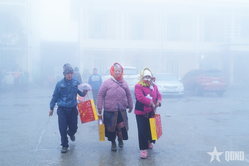 | Trong tiết trời giá lạnh, người dân xã biên giới Sơn Vĩ (Tuyên Quang) phấn khởi mang theo những phần quà Tết về nhà. |