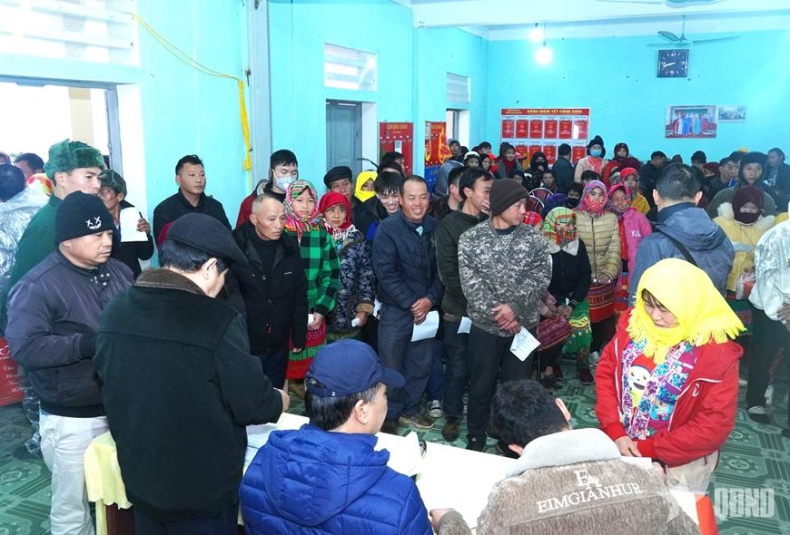 | Đông đảo người dân xã biên giới Sơn Vĩ (Tuyên Quang) đến nhận quà Tết. |