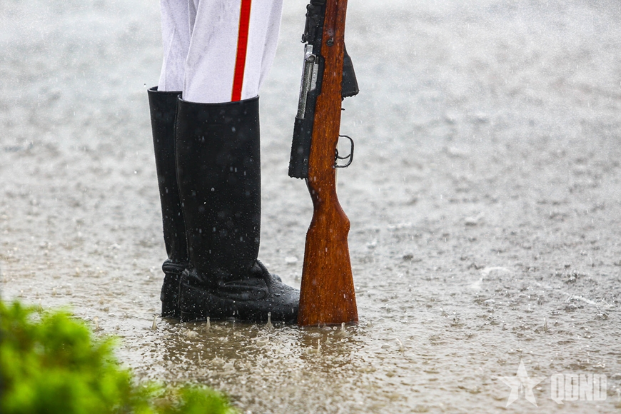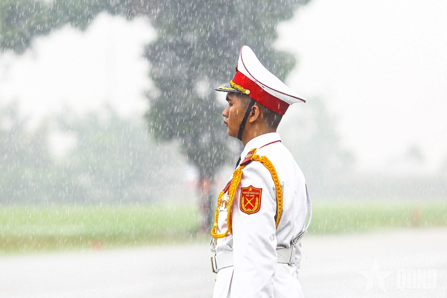 Trong buổi tổng hợp luyện, cơn mưa lớn bất ngờ trút xuống khiến việc tập luyện vốn đã khó khăn lại càng khó khăn hơn song các lực lượng đều thực hiện nhiệm vụ với tâm thế phấn chấn, thần thái nghiêm trang.