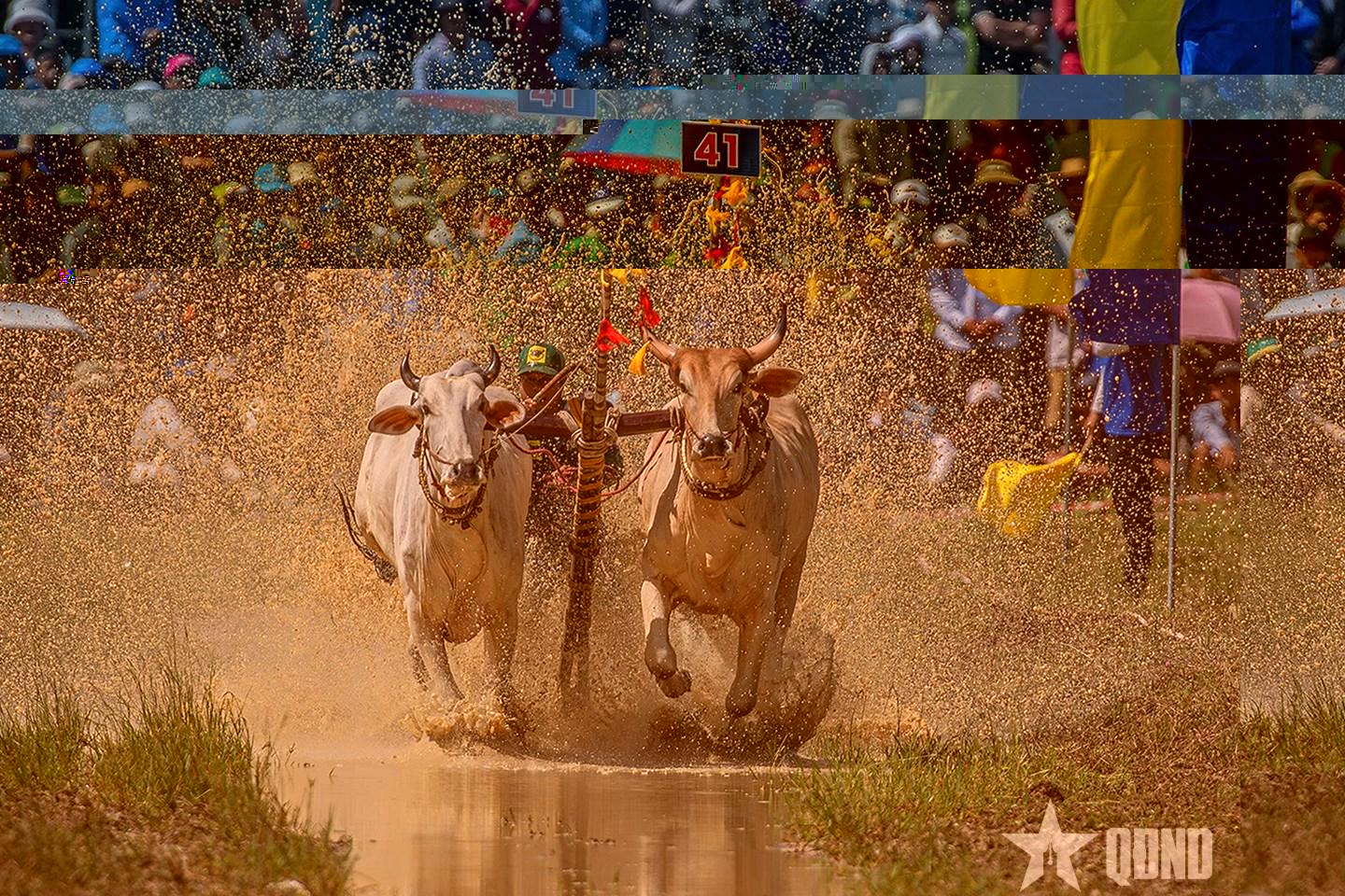 Tiếng nhạc ngũ âm rộn vang. Những đôi bò lao lên, xé tung mặt ruộng xăm xắp bùn. Từ khán đài, cả ngàn ánh mắt dõi theo, tiếng reo hò vang như sấm. Tôi đưa máy theo dõi, tay bấm liên tục. Không dễ chút nào để bắt kịp khoảnh khắc bùn đất bắn tung, đôi bò căng mình phi nước đại, hay gương mặt nài bò nhăn nhó, tập trung cao độ.