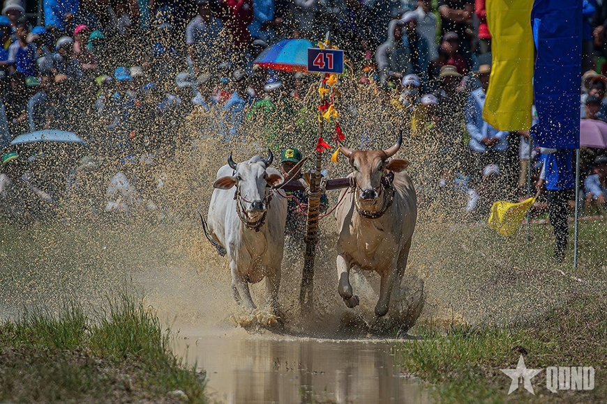 | Tiếng nhạc ngũ âm vang, bùn đất tung tóe, mỗi đôi bò bứt tốc là cả sự phối hợp nhuần nhuyễn giữa sức vóc và kỹ thuật điều khiển của nài bò. |